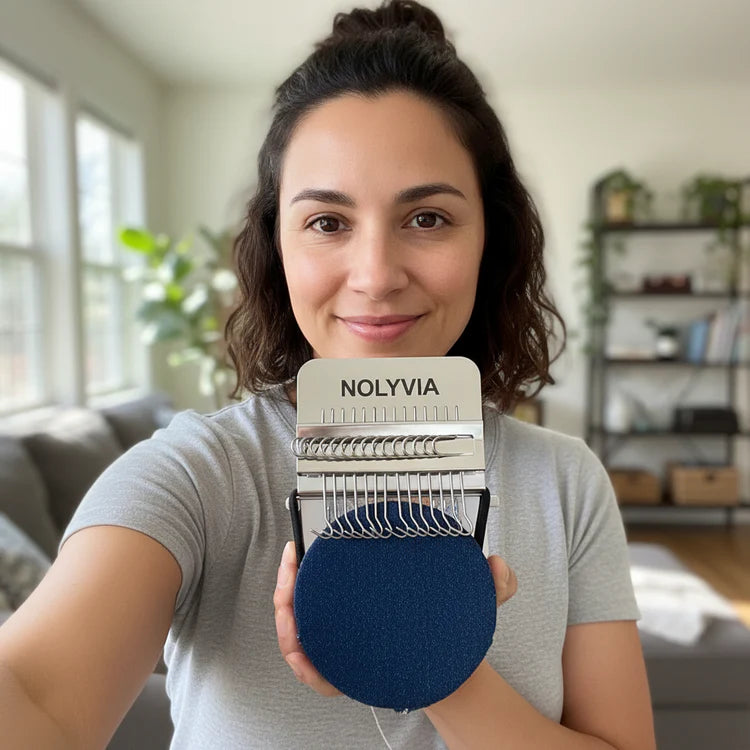 The Nolyvia™ PatchMaker 2.0 Kit is a complete all-in-one solution for textile restoration. Each kit features our signature 2-inch stainless steel loom and ergonomic beechwood base. We’ve packed it with 12 multi-sized needles in a handy capsule, a latch hook, a yarn needle, and three high-tension elastic bands. It’s designed to handle everything from heavy upholstery to your softest wool cardigans with total ease and precision.